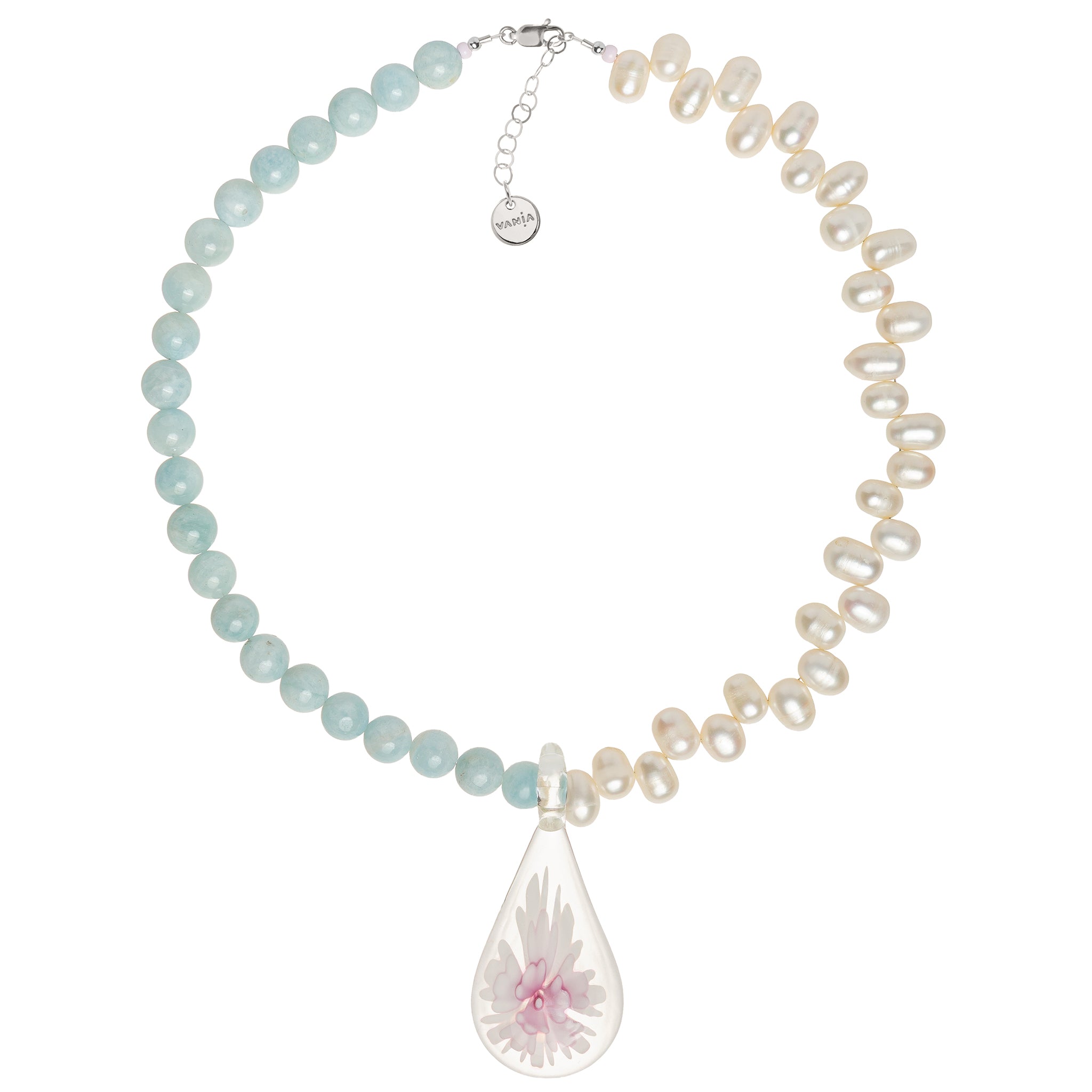 Cool and dreamy, this necklace is hand-strung with soothing aquamarine beads on one side and lustrous freshwater pearls on the other. At its centre hangs a delicate handmade glass teardrop pendant featuring soft pink blooms suspended inside, like a tiny underwater garden.