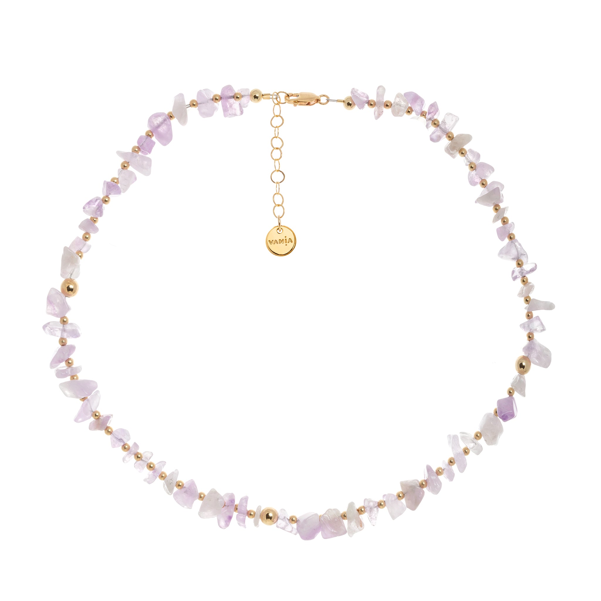 The Amuleto Amethyst Choker is crafted from lavender amethyst chip and elevated with 14karat gold-filled beads. Each bead is threaded by hand individually with lots of patience, love & happy thoughts resulting in a piece that truly shines.