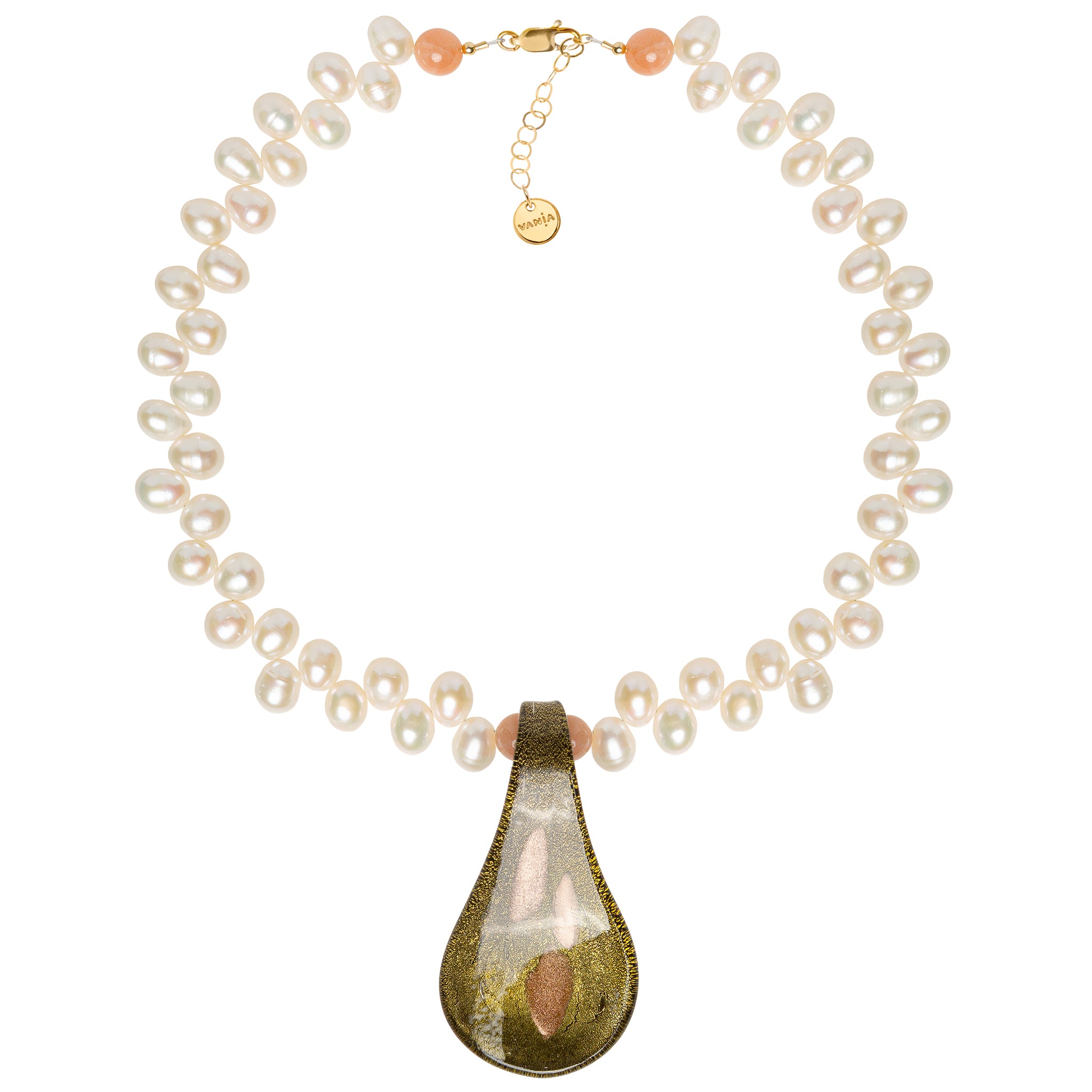 A question worth asking! This necklace is handcrafted with lustrous freshwater pearls and soft peach-toned gemstone accents, finished in 14k gold-filled. At its centre rests a striking handmade glass pendant—each one a miniature sculpture of colour and light.