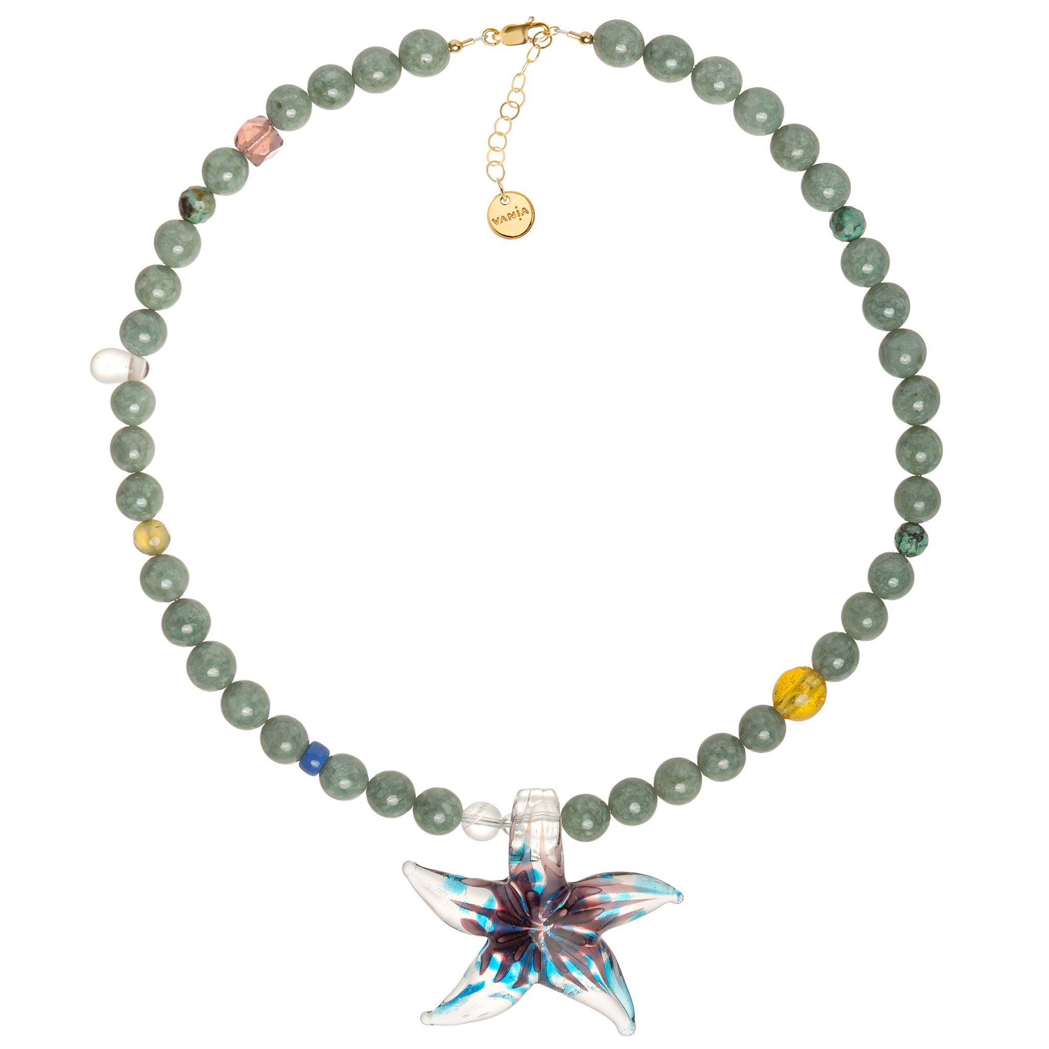 Calm yet full of life, this necklace is handcrafted with smooth jade beads and a playful scattering of mixed gemstones that catch the light in unexpected ways. At its centre hangs a handmade glass starfish pendant—a reminder to dive deep, sparkle freely, and let a little fun guide the way.