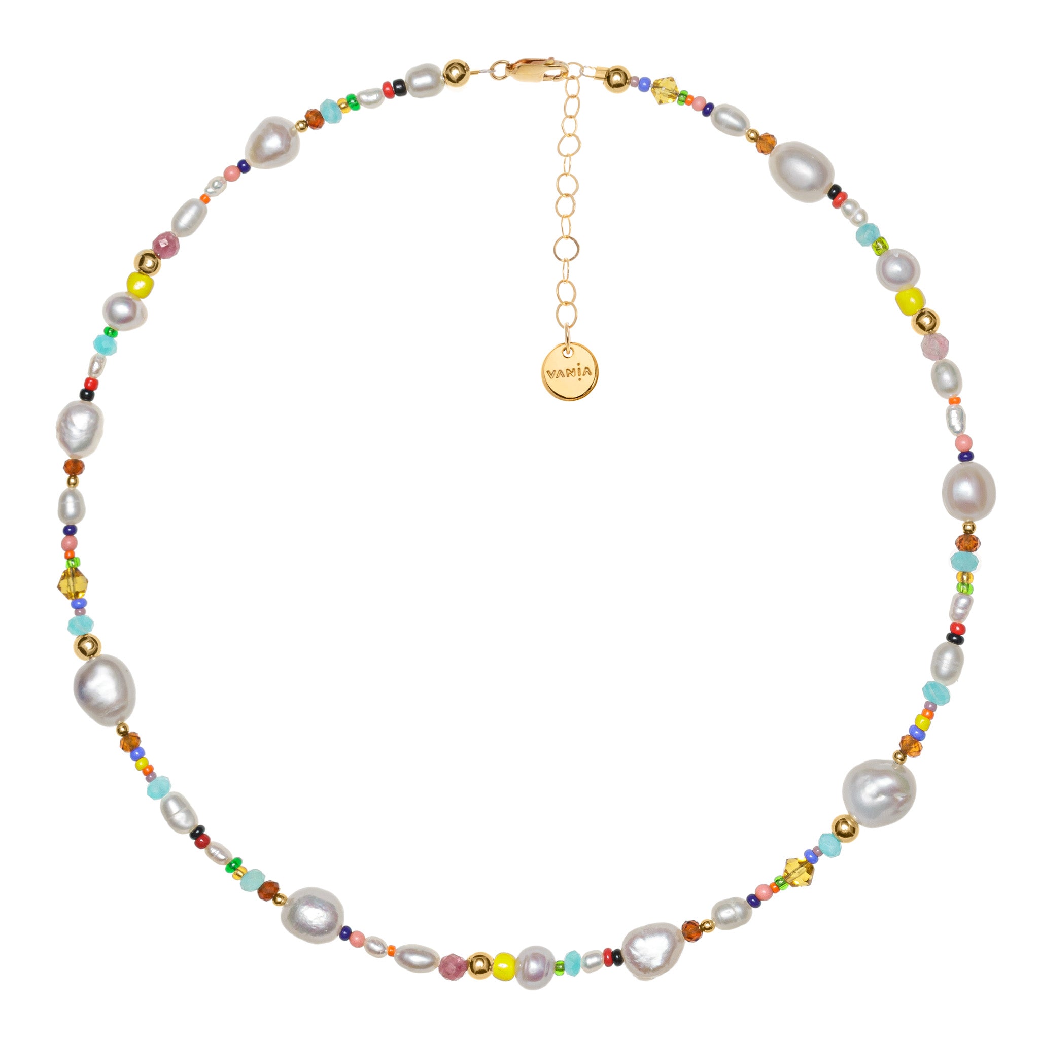 This necklace is hand-crafted with freshwater pearls paired with our joyful glass and gemstones mix. Finished with 14ct gold-filled beads and clasp.