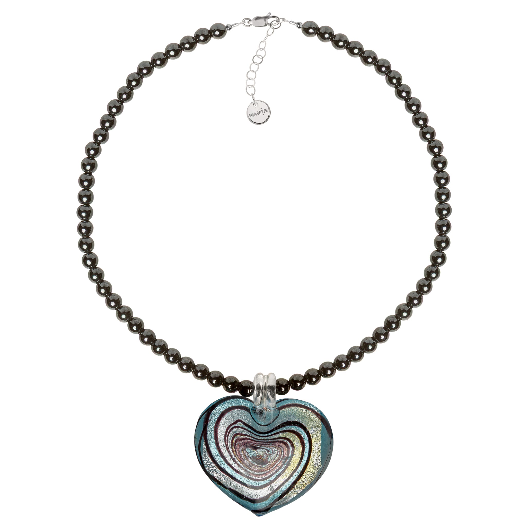 Striking and magnetic, this necklace is handcrafted with polished hematite beads that shimmer with a mirror-like shine. At its centre hangs a handmade glass heart pendant swirling in metallic tones of turquoise and bronze—a perfect fusion of edge, elegance, and a touch of fun.