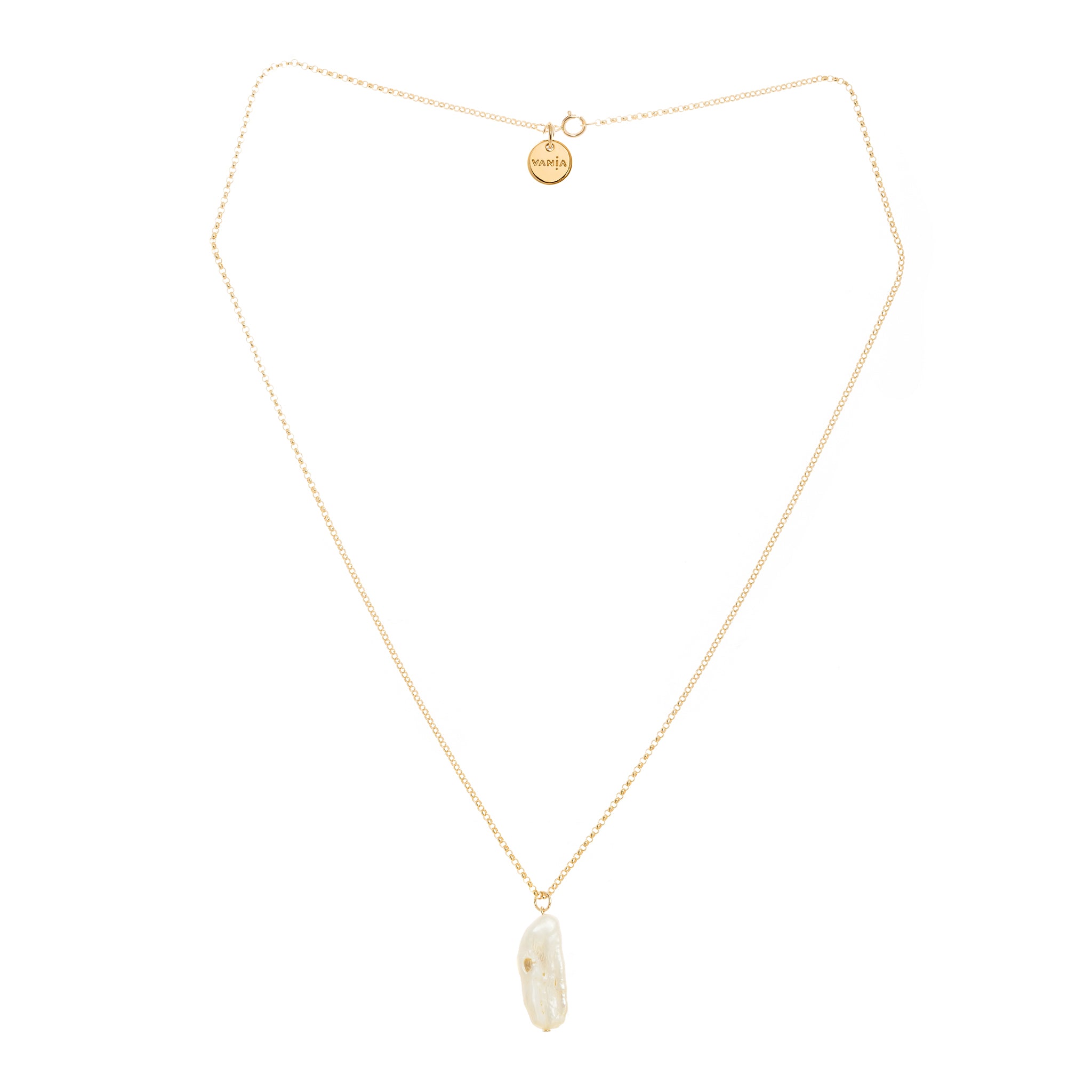 Crafted with 14ct Gold-filled classic rolo chain. This fine chain necklace features a Baroque Freshwater pearl as a pendant and measures 45cm long. It sits a short necklace on your décolletage.