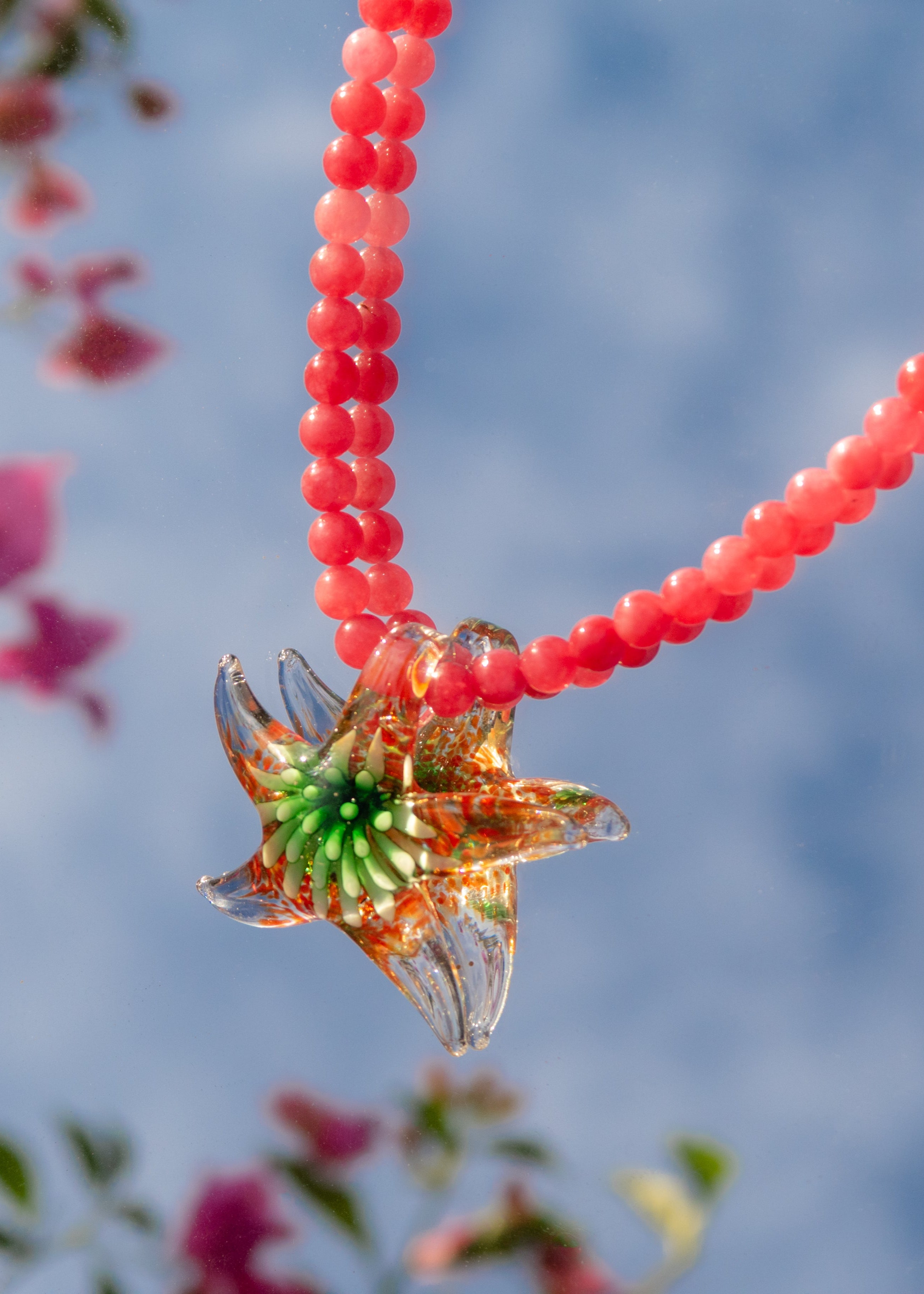This vibrant necklace is handcrafted with rich Brazilian rhodonite beads. At its centre hangs a striking handmade glass star pendant, alive with a burst of orange, green and white detail.