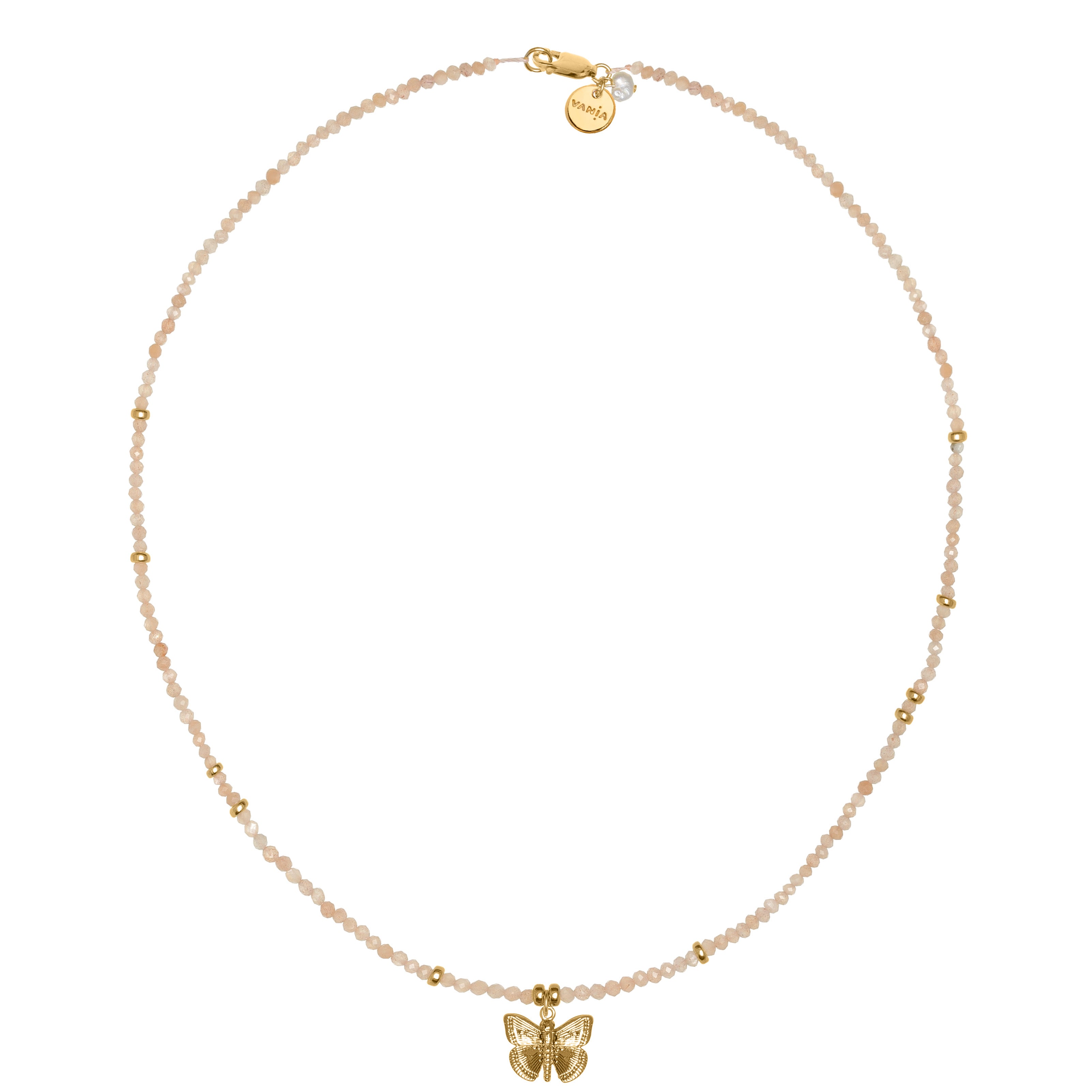 The Mystical Moonstone necklace is more than jewellery; it's a symbol of transformation and natural beauty. Handmade with tiny peachy moonstone beads and finished with a gold-filled butterfly charm and beads. Wear this necklace as a reminder of your own metamorphosis.