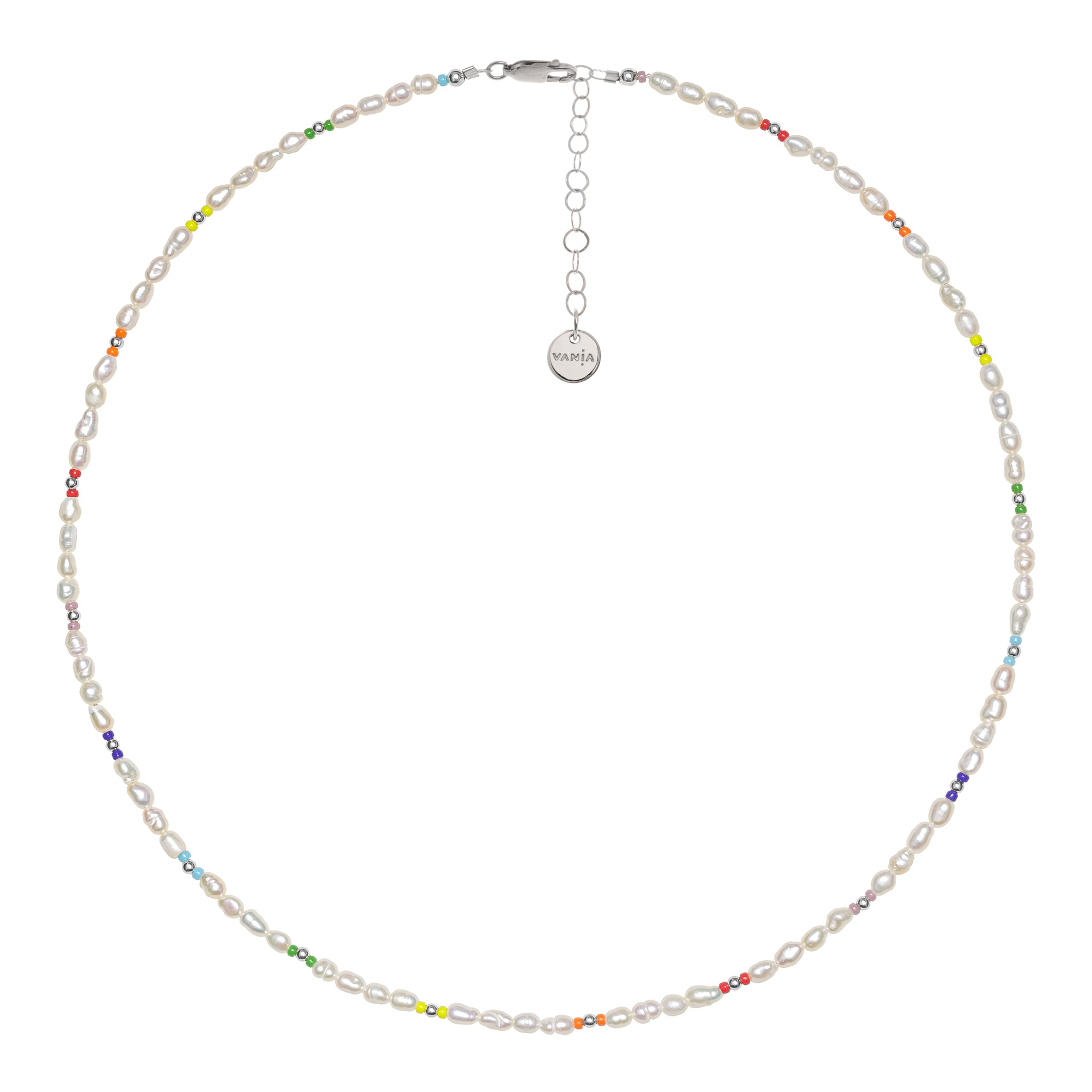 Dainty and FUN this necklace is handcrafted with freshwater pearls and tiny Miyuki glass beads forming a rainbow of colours. Finished with 14ct gold-filled beads and clasp.