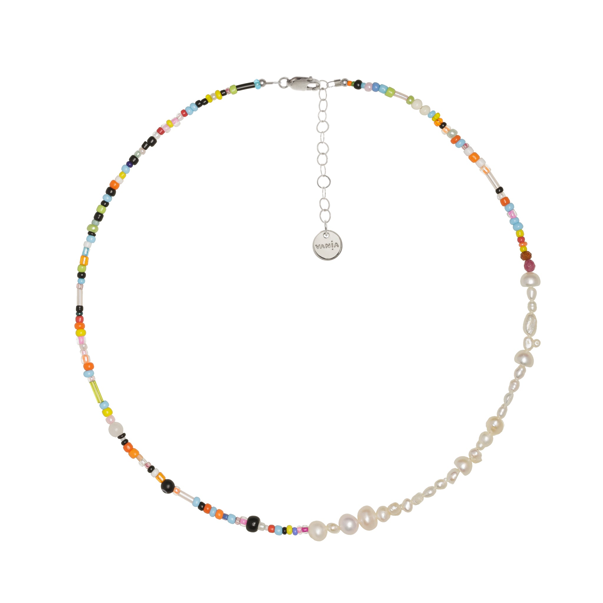 An everyday piece that is handcrafted with a colourful mix of tiny gemstones and glass with a freshwater pearl section to the side. Finished with a Sterling Silver clasp and chain.